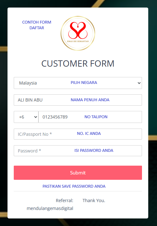agar urusan simpanan emas anda direkodkan dengan betul di bawah sistem Kedai Emas Sri Semantan.